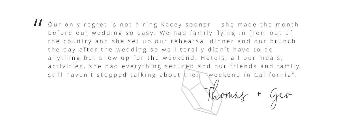 With an uncanny ability to visualize space, keen attention to detail, and a knack for capturing the unimaginable, Kacey creates spectacular celebrations that leave guests breathless. Let her embrace your ideas and take your vision to the next level; her signature style is all about celebrating your signature style to a tee.